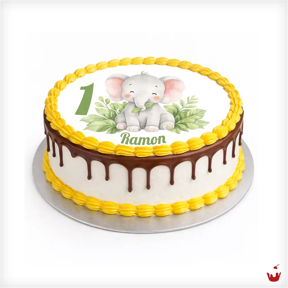 Niedliche Jungle Elefanten-Fototorte. Form, Geschmack und Verzierung individuell wählbar – ideal für Kindergeburtstage und besondere Anlässe.