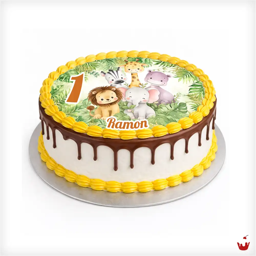 Diese liebevoll gestaltete Jungle Fototorte bringt echtes Safari-Feeling auf den Geburtstagstisch. Das kindgerechte Motiv mit Zebra, Giraffe, Elefant, Löwe und Nilpferd bleibt fest erhalten und wird in brillanter Qualität auf einen essbaren Tortenaufleger gedruckt. Alle weiteren Details gestalten Sie ganz nach Ihren Wünschen.